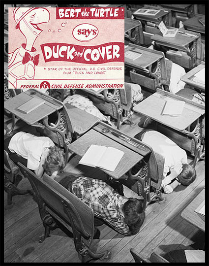 (Too bad he was 50 years too late for Duck and Cover … he would have been an expert at it! Oh, and this is usually where he would end up in a restaurant, too.)